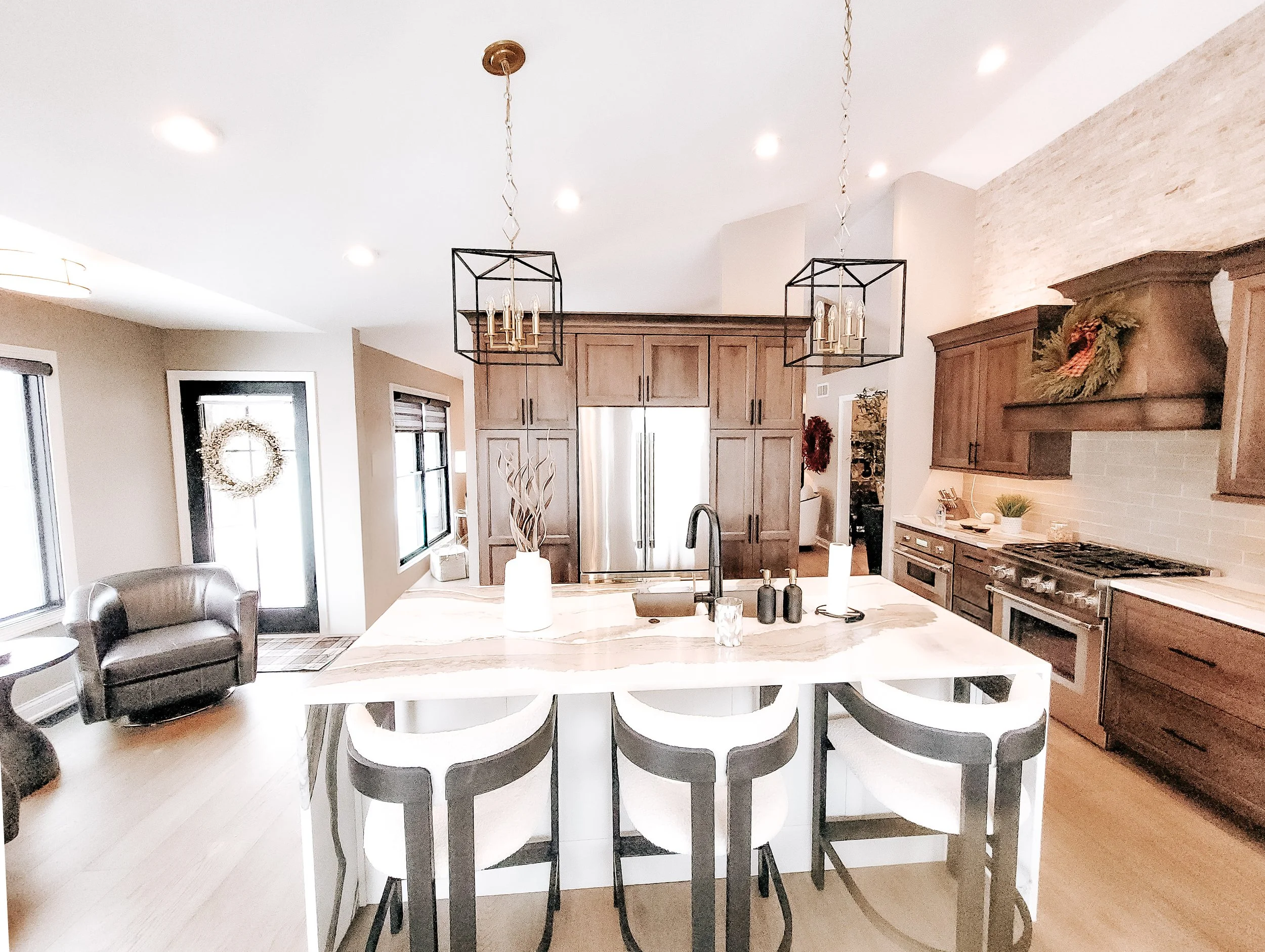 Center Island with Impact: A waterfall-edge island showcases dramatic veining and doubles as a gathering space with seating for three. Overhead, oversized geometric pendants in black and brass add sculptural beauty and ambient light.