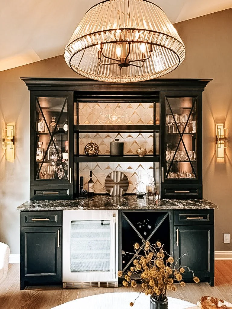 Bar & Entertaining Space: The adjoining bar features bold black cabinetry, mirrored and geometric tile backsplash, and glass-front uppers for a modern glam aesthetic. A built-in beverage fridge and wine storage make entertaining effortless, while the statement chandelier elevates the space to showroom quality.